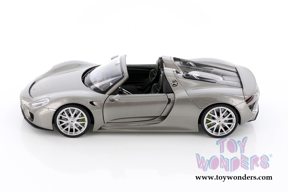 24055HC/4D Welly - Porsche 918 Spyder Assortment (Hardtop and Convertible). 1:24 scale diecast collectible model car. This Porsche 918 Spyder is a 7.5"L x 3.25"W x 1.75"H diecast metal car with freewheeling openable doors. This Porsche Spyder is manufactured by Welly. 4 pcs per display box in assorted colors. 24 pcs per inner.