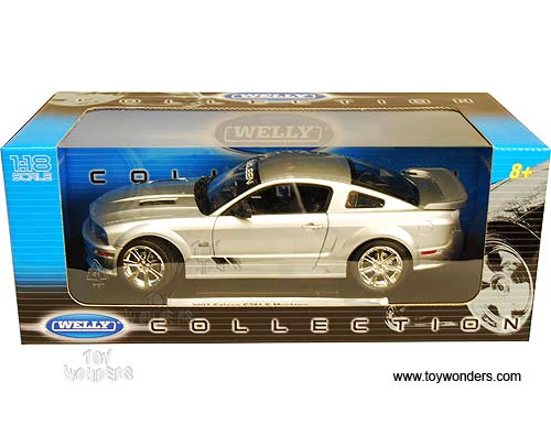 12569 WELLY - 2007 Saleen S281 E Mustang Hard Top. 1:18 scale diecast collectible model car. This Saleen S-281 is a 10.25"Lx 3.75"Wx 3"H diecast collection car with openable hood, doors & trunk. It features steerable front wheels, detail components, and is mounted on a display stand. This Saleen S281 is manufactured by Welly. Item 12569 is in SILVER color. Individually packed in a window box. Box size: 13.25"Lx 6.25"Wx 5.25"H.