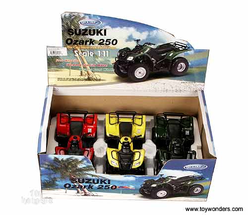 62182/3D Welly - Suzuki Ozark 250 ATV. 1:11 scale diecast collectible model car. This Suzuki Ozark is a 6.5"L x 3.75"W x 3.5H die cast metal with free wheeling & workable steering wheel. This Suzuki Ozark 250 ATV is manufactured by WELLY. 3 pcs per display box and in assorted colors. 12 pcs per inner.