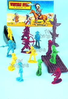 68156 Western Cowboy Set. Plastic Indians & cowboys toy action figure play set includes canoe, raft, and figures. pkg. size: 6.25"x10.5". 36 sets/inner.