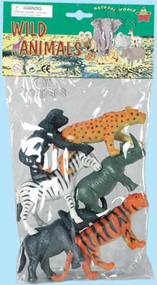9925/6 Wild Animals. 4.5"-5.5" plastic wild animals. 6 assorted animals in a pack. Card size: 7"x13".