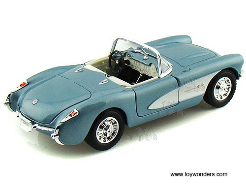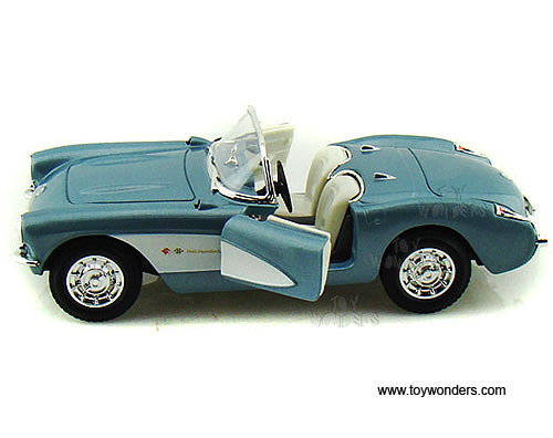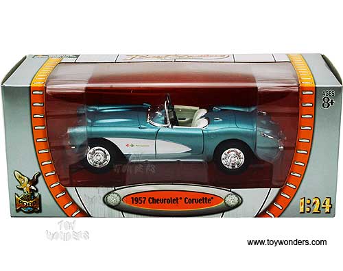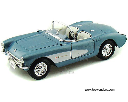 24201 Yatming - 1957 Chevrolet Corvette Convertible. 1:24 scale diecast collectible model car. This Chevy Corvette is a 7"L x 2.75"W x 2"H diecast metal car with free wheeling, and openable doors. Individually packed in a window box WB. Box measures 10.25"L x 4.75"W x 4.25"H. This 1957 Chevrolet Corvette is manufactured by Yat Ming. Item 24201 is in BLUE color. GM is a trademark of the General Motors Corporation.
