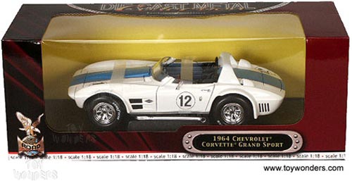 92698W Road Signature/ YatMing - 1964 Chevy Corvette Grand Sport. 1:18 scale diecast collectible model car. This Chevrolet is a 9" long diecast convertible #12 with openable doors, hood & trunk. Yat Ming Deluxe Edition. Mounted on a plastic platform stand. Road Signature. 92698W in WHITE color with Blue stripe. Individually packed in a window box. GM is a trademark of the General Motors Corporation.