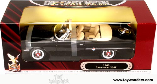 92748BK YATMING - 1960 Chrysler 300F Convertible. 1:18 scale diecast collectible model car. This 1960 Chrysler 300 F Convertible is 12"Lx 4.5"Wx 2.75"H die cast metal with opening hood & doors. Workable steering and free wheels. Die Cast Metal Collection Deluxe Edition. Sits on a display plaque. This 60 Chrysler 300-F is manufactured by Yat Ming and is part of their Road Signature series. Individually packed in a window box. Box size: 14.25"Lx 6"Wx 5.25"H. 92748 in BLACK color.