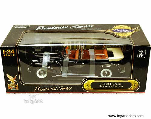 24088 ROAD SIGNATURE/YATMING - 1939 Ford Lincoln Sunshine Special Convertible limousine with Flags. 1:24 scale diecast model car. This limo is 10.25" long diecast car with opening doors & hood convertible. Presidential Series. 24088 in BLACK color. YAT MING. Individually packed in a window box WB.