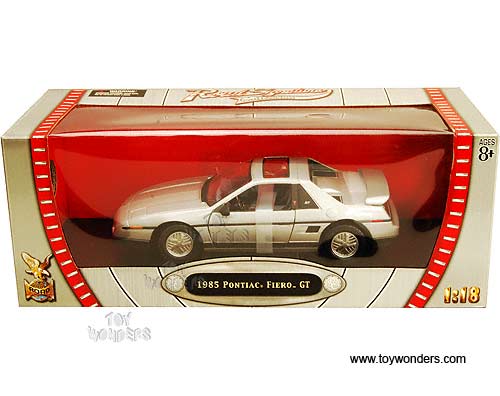 92588 YATMING ROAD SIGNATURE - 1985 Pontiac Fiero GT. 1:18 scale diecast. This 1985 Pontiac Fiero GT is a 9"Lx3.25"Wx2.5"H diecast metal race car with highly detailed engine and interior, workable steering, and opening doors/rear hatch. Sits on a plaque. This 85 Pontiac Fiero GT is manufactured by Yat Ming. Individually packed in a window box. Item 92588 is in SILVER color. GM is a trademark of the General Motors Corporation.   To see more Yatming die-cast collector models (click here).   Case pack: 6 pcs. Price quoted is for 1 pcs.