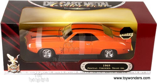 92368O YATMING ROAD SIGNATURE - 1969 Pontiac Firebird Hard Top. 1:18 scale diecast car. This 1969 Pontiac Firebird is an 11"L x 4"W x 3.25"H diecast metal classic oldies car has opening hood/trunk/hood, folding seats, free wheels, and workable steering. Highly detailed engine and components. Individually packed in a window box. Box is 14"W x 5.25"H x 6"D. This 69 Pontiac Firebird is manufactured by Yat Ming. 92368 in ORANGE color. GM is a trademark of the General Motors Corporation.