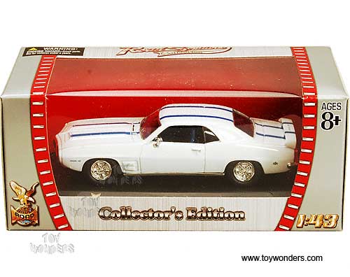 94238W Yatming Road Signature - 1969 Pontiac Firebird Trans Am Hardtop. 1:43 scale diecast collectible model car. This Pontiac Firebird Trans Am is a 4.25"L x 1.5"W x 1"H diecast metal car. Sits on a display plaque. Road Signature collection. The 1969 Pontiac Firebird Trans Am is manufactured by Yat Ming. 94238W is WHITE in color with Blue stripes. Individually packed in a window box. Box size: 6"L x 3"W x 2.5"H. 12 pcs per inner. GM is a trademark of the General Motors Corporation.