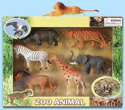 9804/6 Zoo Animal. 6 pcs zoo animal collection. Assorted animals: zebra, elephant, lion, tiger, and etc. pkg size: 11.65"Lx9"Hx1.50"W. Package with animal handle.