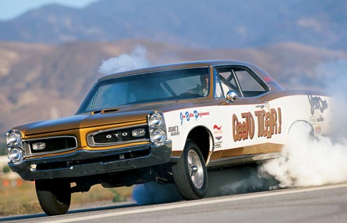 Jim Wangers, along with everybody's favorite felonious car executive Jon Z. DeLorean, more or less hatched the original GTO way back when. A few years later, in cahoots with the old Royal Pontiac store, Wangers was totally responsible for the Judge. He even copped gold at a few NHRA national events in the early ’60s in Pontiac Stockers, then became one of the hippest car marketers of all time. In ’66, Wangers’ GeeTO Tiger program was pure schtick, a promotional boil aimed at getting enthusiasts involved on the ground level. Selected individuals at certain dragstrip events would be invited to beat the Tiger (actually one of the Royal crew sweating into his socks beneath a ridiculous striped getup) in a heads-up race with two Goats: one with a black panel, the other with a white panel.