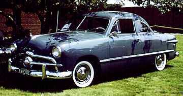 Ford brought out it's first new post WWII car designs in 1949. This Custom Club Coupe shows how different they were from the previous models. Engines were either a 95hp six or a 100hp V8. Standard and Custom models looked the same except for the "Ford Custom" on the side trim.