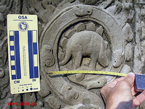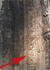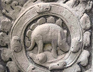 Intricately carved statues and stone columns fill the temple-monastery. On the stones, the ancients depicted animals, people, gods, various plants, and a host of other decorative images. But one column of carvings maintains a special interest to those interested in dinosaur/human coexistence. Concerning this particular column, Freeman and Jacques wrote: “On the angles and corners of the porch are numerous small scenes and representations of animals, both real and mythical” (p. 144). Of special note, the authors wrote about one of the carved animals, saying: “Among the vertical strip of roundels in the angle between the south wall of the porch and the east wall of the main body of the gopurathere is even a very convincing representation of a stegosaur”