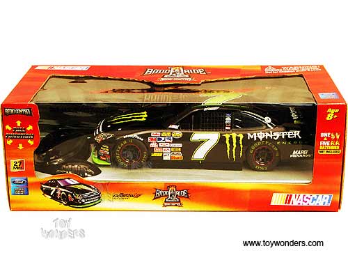 11607 1 Badd Ride Nascar - R/C Radio Control 7F Ford Race cars. Approximately 1:18 scale. This Ford racing radio controlled car is 11" long with full function. Includes vehicle, antenna & transmitter. Requires one 9V & five "AA" batteries. Each car individually packed in a window box. Box size: 15.25"L x 7"W x 5.25"H. 11607 is in assorted colors. For ages 8 years and up.