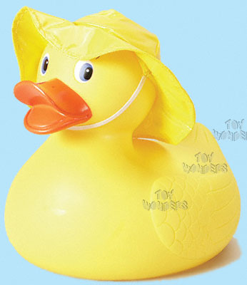 1083R 10" Rubber Duck with Rain Cap. Cute rubber duckie measures 10" long, 10" high, and 8.5" wide. Yellow rain hat attaches to head with elastic band. Duck also floats!
