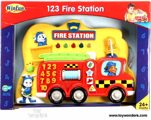12207E Battery Operated 123 Fire Station. This interactive fire station features 5 learning activities including number and shape recognition, counting, find it game, guessing game, and music. Cheerful melodies, fun sound effects and glowing flames. Built-in handle. In a TRY ME box. For ages 24+ months. Includes 3 "AA" batteries. Box size: 16.5"Lx 12"Wx 3"H. 6 pcs per inner.