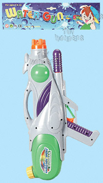 227PC Water Gun. 16" long water gun with pump action. Hang up poly bag package: 9.75"x18".