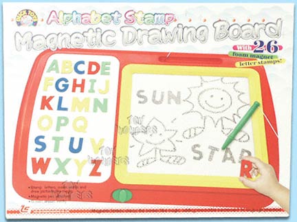 1779 2 In 1 Stamp Drawing Set. 18.5" board with a pen. One sweep of the erase button clears the entire screen. Also include 26 foam letter stamps. Box size: 19.5"L x 2"W x 14.75"H.