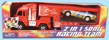 63319 2 in 1 Sonic Racing Team. 21" container holds 8.5" yellow racing car. Press buttons for driving sounds. 2 "AA" batteries included. Colors/styles vary. Box size: 22.5"Lx5.75"Wx7"H. 8 pcs/inner.