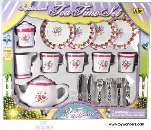 9966 25 PCS Tea Time Set. Includes 1 teapot, 1 suger bowl, 1 creamer, cups, plates and silverware. Box size: 14"L x 11.5"W x 2.75"H.