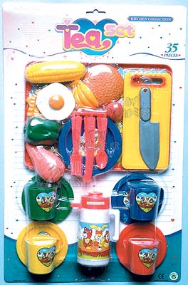 C6111 35 Pieces Tea Set. 35 pcs tea set includes cups, pitcher, cutting board, utensils, plates, egg, corn, hamburger, and more. Card size: 12"x18.5". 12 sets/inner.