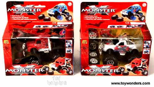 2410W 4WD Friction Power Monster. 5" cars feature super friction power, 4 wheel drive with individual suspension, and interchangeable big wheels. These trucks come with extra wheels. Approximately 1:38 to 1:43 in scale. Individually packed in a window box. Box size: 7.25"Lx 4"Wx 6.75"H. 12 pcs per inner box. Note: These vehicles contain no diecast metal. 2410W in assorted styles.