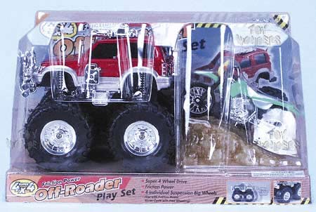 6" friction powered 4x4 with monster tires. Set includes 4.5" free wheel dirt bike.