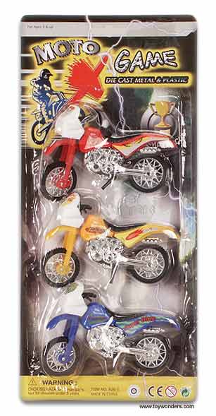 626/3 3 Motorcycle Set. Die cast metal with plastic parts. A set includes 3 asstd. colors and style (RED, YELLOW, BLUE). Card size: 6" x 13".
