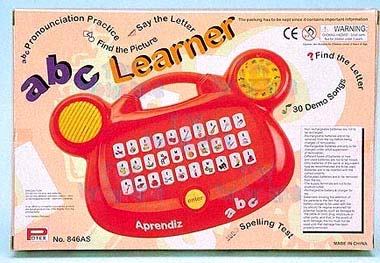 846AS ABC Learner (Spanish) 12.5" ABC learner that features pronunciation practice, find the picture, find the letter, spelling tests & more. requires 3"AA" batteries. box size: 13.5"Lx1.75"Wx9"H.