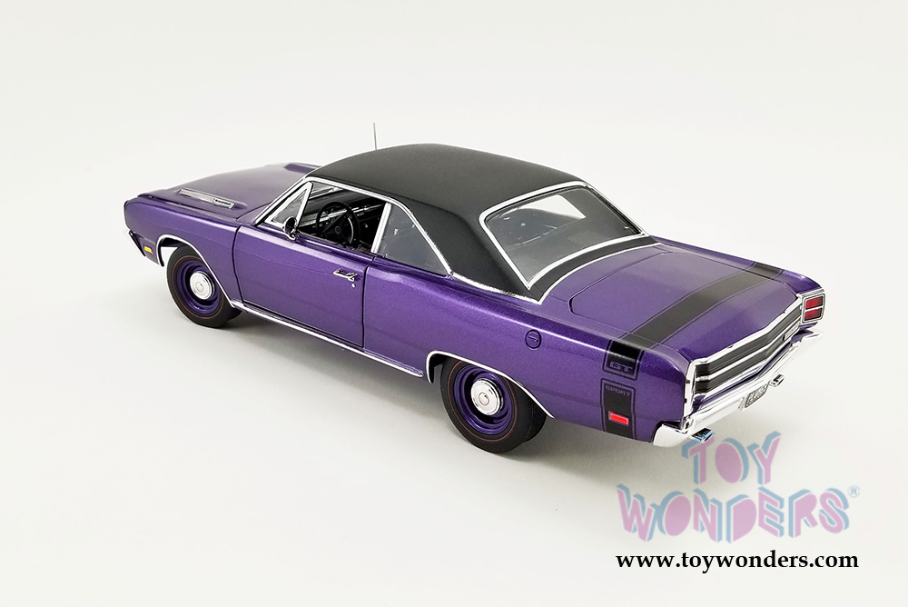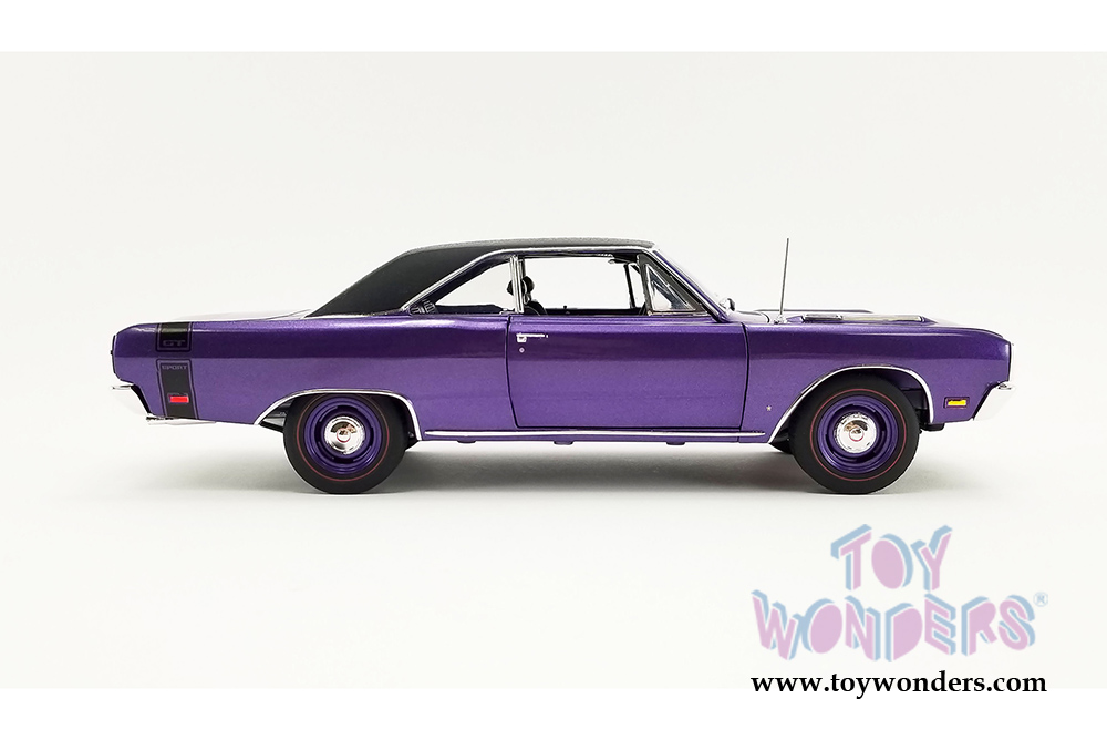 A1806406VT ACME | 1969 Dodge Dart GTS 440 Vinyl Top. 1:18 scale diecast collectible model car. This is a 10.75"L x 4"W x 3"H car with free wheels and workable steering. This Dodge Dart features cloth seat belts and poseable steering. Plumbed and wired engine with serialized plate. This Dodge is manufactured by ACME. Box size is 14"L x 7"W x 5.25"H. Item A1806406VT is in Plum crazy PURPLE color. Limited Edition to 522 pcs.