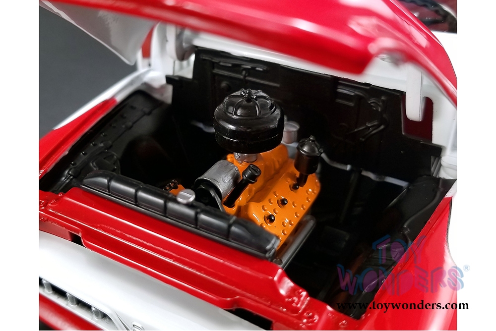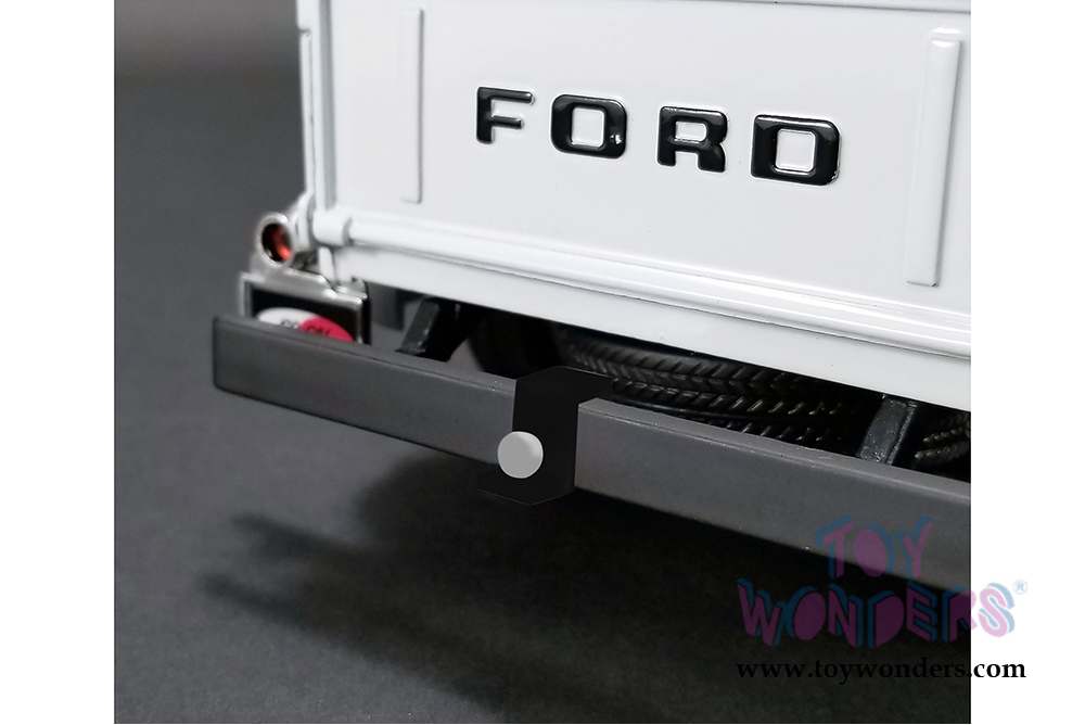This Ford F100 is a 10.5"L x 4"W x 4"H diecast car with poseable steering. Plumbed and wired engine with serialized plate. This '53 Pick-Up truck is manufactured by Acme. Item 1807208 comes in WHITE with Red color. Individually packed in box. Box size: 14.5"L x 6"W x 5.25"H.