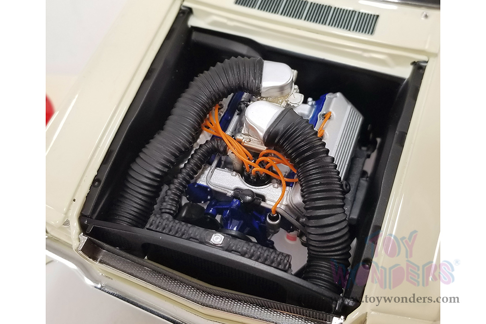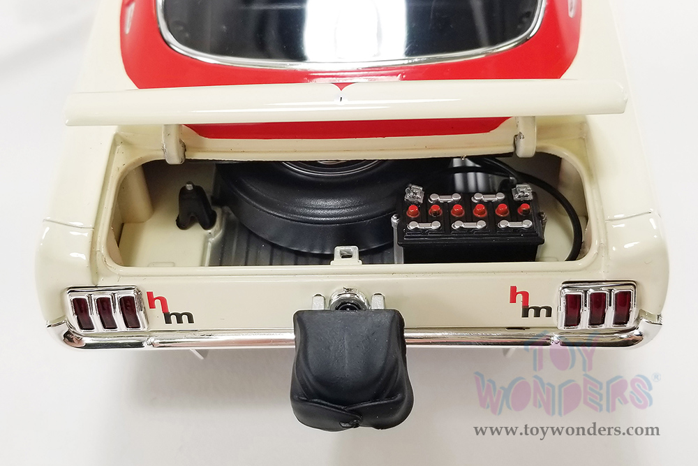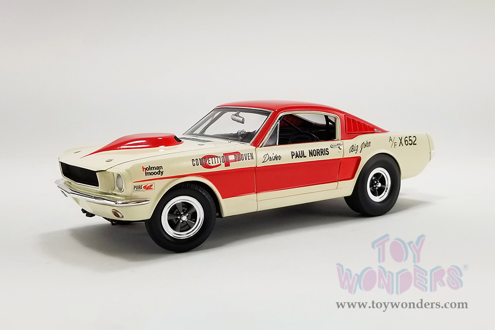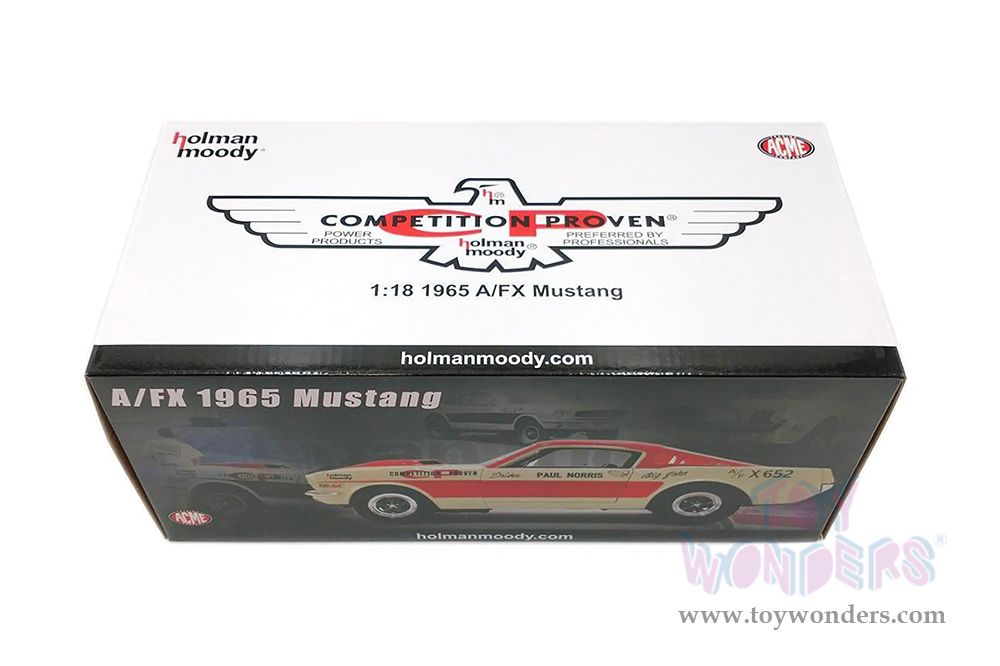 A1801855 Acme - 1965 Ford Mustang A/FX "Holman Moody". 1:18 scale die-cast collectible model. This Ford Mustang is a 10.25"L x 3.75"W x 3"H diecast metal car with openable doors and a trunk. This '65 Ford Mustang is manufactured by Acme. Individually packed in a decorated box. Box size: 12.75"L x 6"W x 5.25"H. Limited Edition to 636 pcs.
