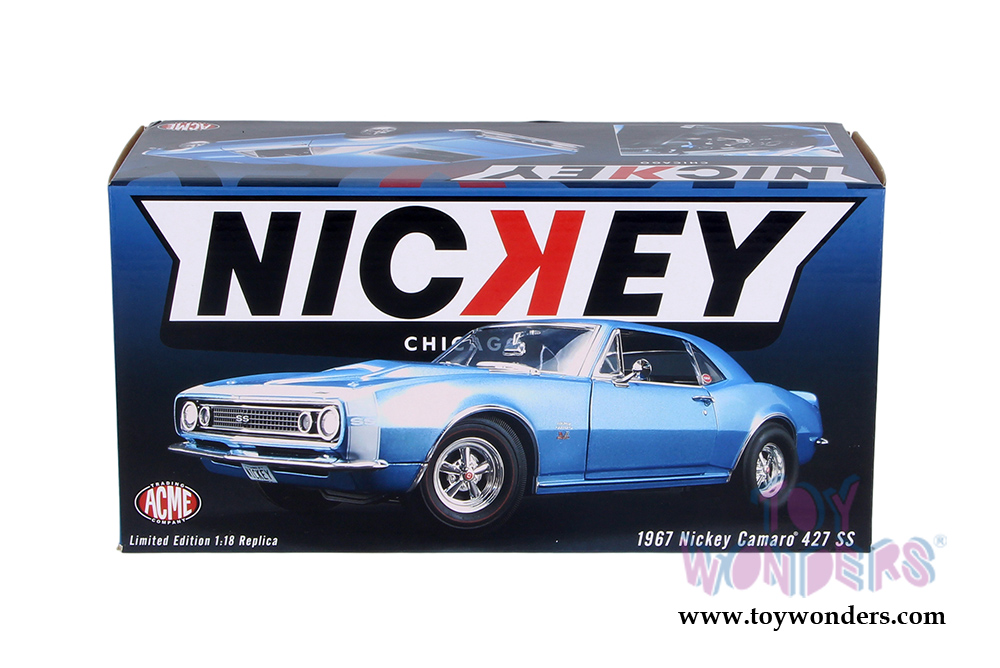 1805706 Acme - 1967 Nickey Chevrolet® Camaro® 427 SS Hardtop. 1:18 scale diecast collectible model. This Chevy Camaro features cloth seat belts with poseable steering. Plumbed and wired engine with serialized plate. This '67 Camaro is manufactured by Acme. Individually packed in decorated a box. Box size: 11.75"L x 6"W x 5"H. Limited edition to 600 pcs.