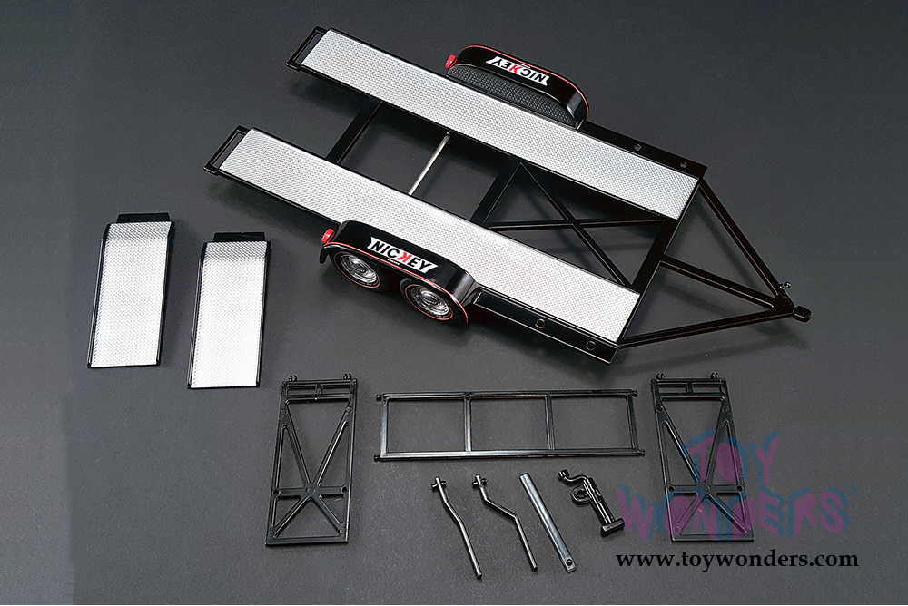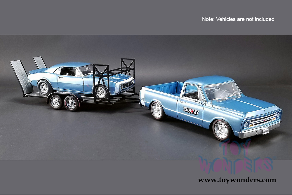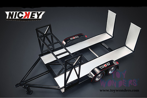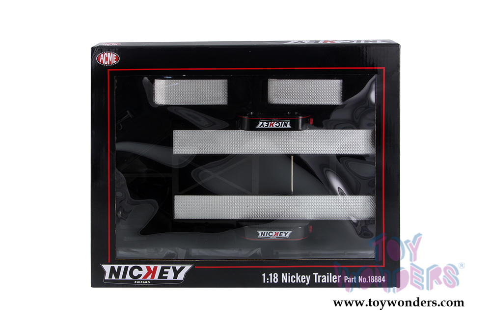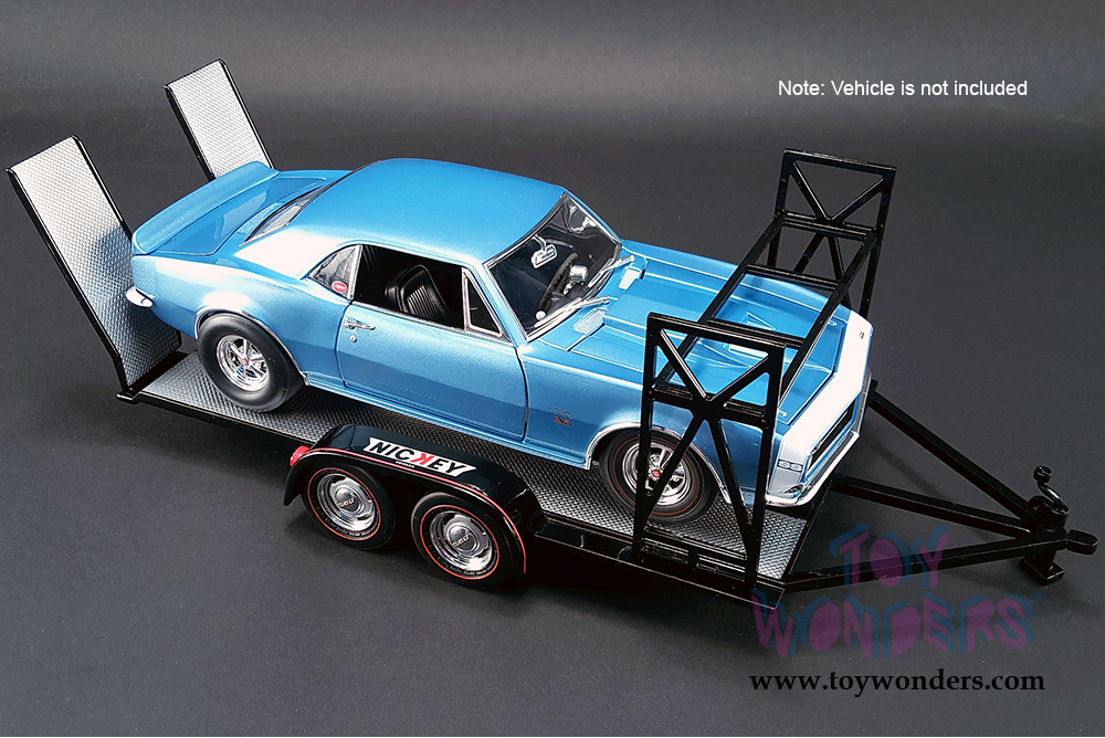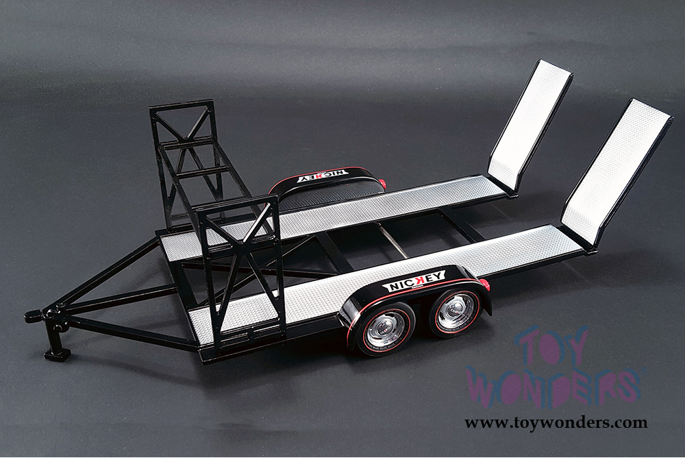 18884 Acme - Nickey Chevrolet Tandem Car Trailer with Tire Rack. 1:18 scale diecast metal car trailer. 13" long (10" long when folded) x 6.25"W x 1.25"H with authentic details. Freewheeling. This showcase Comes with plate and screws to secure 1:18 scale car securely if desired. Ramps fold up. The stand at the front of the trailer can be retracted. Box measures 14"L x 12"W x 2"H. Show case is manufactured by ACME. Note: Car is not included.