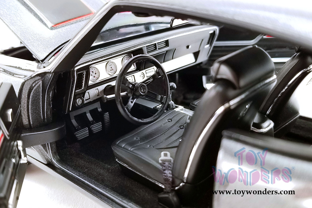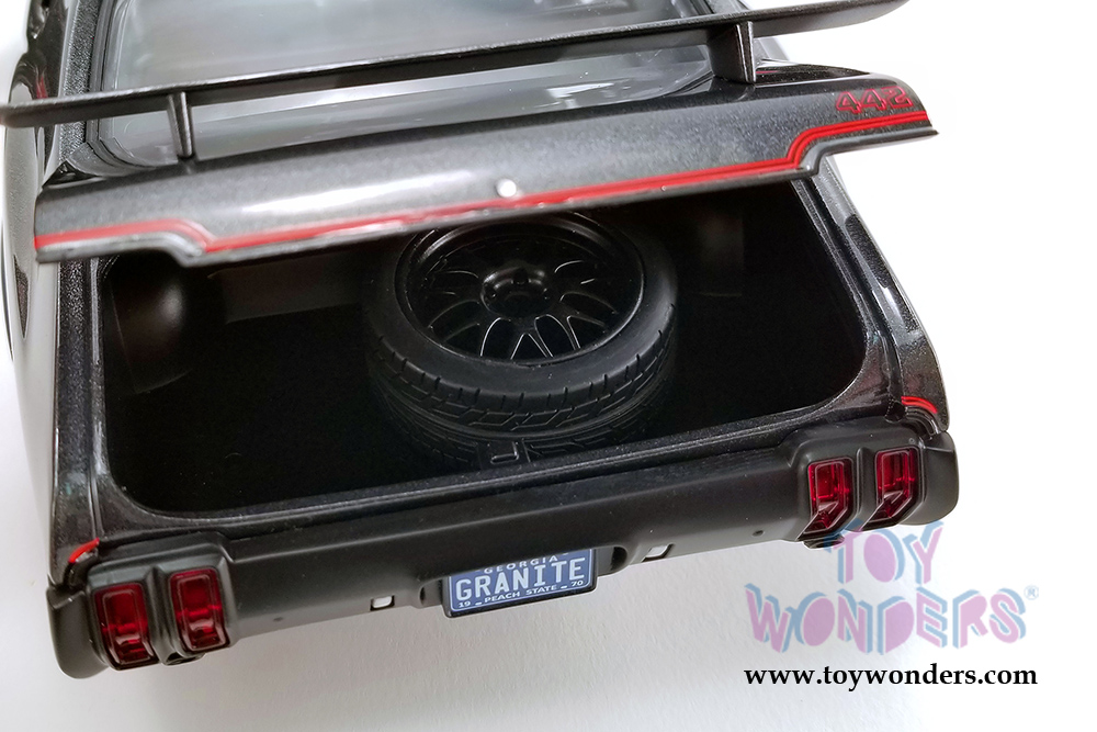 A1805617 Acme - 1970 Oldsmobile® 442 W30 Street Fighter Hardtop. 1:18 scale die-cast collectible model. This Oldsmobile® comes with opening doors, hood and trunk. Manufactured by Acme. Individually packed in decorated a box. Box size: 13"L x 6.25"W x 5.25"H. Limited Edition to 700 pcs. Item A1805617 is in Granite Gray with Red Stripes.