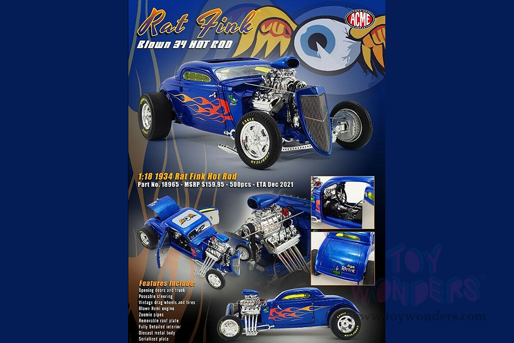 Acme - Rat Fink Hot Rod Blown Altered Coupe (1934, 1/18 scale diecast model car, Blue) 18965