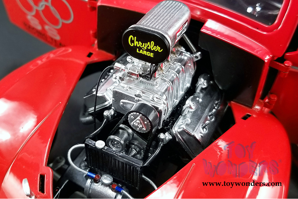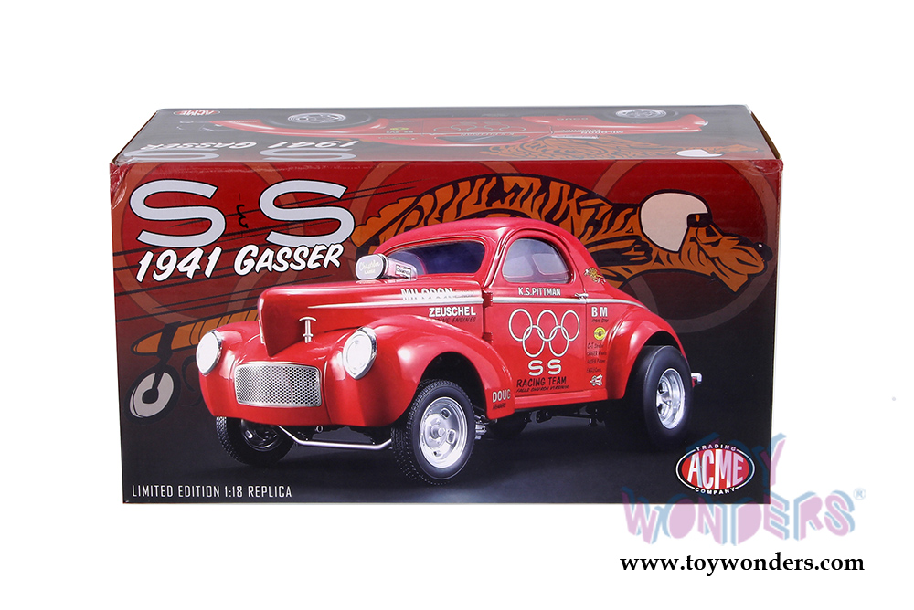 This Gasser oldies car is a 9"L x 3.75"W x 4"H diecast metal car with freewheeling with workable steering. Openable doors and removable hood. Highly detailed engine and components. Limited Edition to 828 pcs. This 1941 SS Gasser is manufactured by ACME. Box size is 12"L x 6.5"W x 6.5"H. Item 1800908 is in RED color.
