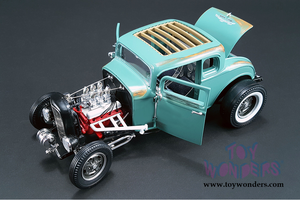 1805012 Acme - Southern Speed & Marine 1932 Ford 5-Window Hot Rod. 1:18 scale diecast collectible model car. This Ford Classic oldies car is a 10.5"L x 4.5"W x 3.75"H diecast metal car with openable doors and  trunk, open engine, free wheels, and workable steering. Highly detailed engine and components. Limited Edition to 822 pcs. This 1932 Ford 5-Window Hot Rod is manufactured by ACME. Box size is 14.25"L x 6.75"W x 6"H. Item 1805012 is in Satin Light GREEN color.