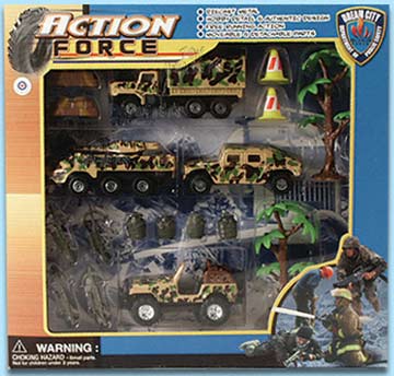 6586M Action Force Military Vehicles. 1:43 scare diecast military vehicles. The action force collection includes: Die-cast metal, hobby detail & authentic design, free running action, and moveable & detachable parts. 3.5"-4" 1 pc of humvee, tank, jeep, truck with accessories. Box size: 11.5"Lx2"Wx11.25"H.