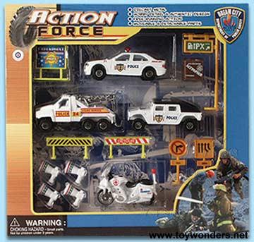 6586P Action Force Police Vehicles Set. 3"-4" diecast metal free wheel police vehicles. Asstd. styles: motorcycle, tow truck, police SUV with accessories. Diecast metal construction.Box size: 11.75"Lx 11.25"Wx 2"H. Sold in case lot quantities only.