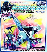 6020 Action Soldier. 8" B/O bump-n-go military jet w/ flashing lights. Also includes a solider w/ machine guns. Assorted styles. Card size: 10.5"x9.5". 12 pcs/inner.