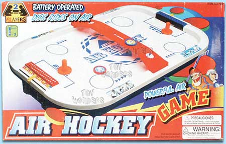 1234 Air Hockey Game. Battery operated 2 player game includes: 20.5" hockey table, 2 blockers, and 1 disk. Disk rides on air. Requires 2 "AA" batteries (not included). Box size: 26"Lx13.25"Wx3.75"H.