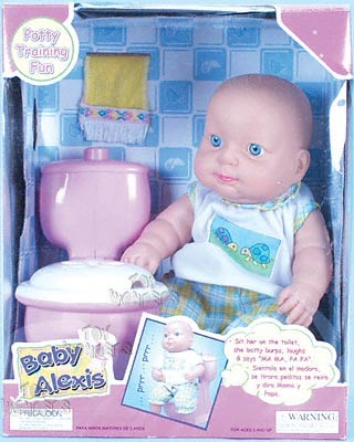 1269A Alexis Flush Doll 13" soft body potty training doll that sits on a toilet. Press the button you will hear flushing sound. Then move the baby, her botty burps and she laughs . Requires 2 "AA" batteries. Box size: 10"Lx7.5"Wx12.5"H. 3 pcs/inner.