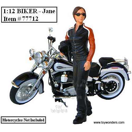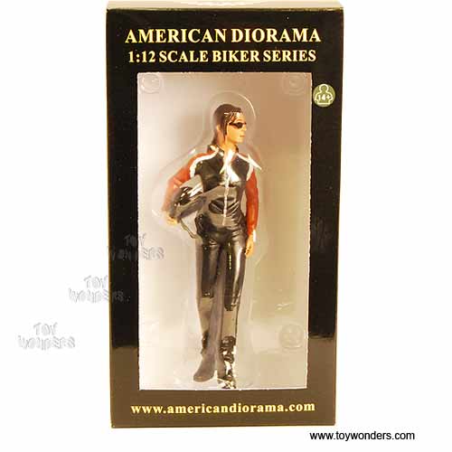 77712 American Diorama Figurine - Biker Series Jane in Black. Hand painted figures. This Jane figure is 5.25", and great for decorating 1:12 scale cars and motorcycles dioramas. Manufactured by American Diorama. Individually packed in a window box. Box size: 4.25"L x 2.25"W x 8"H.