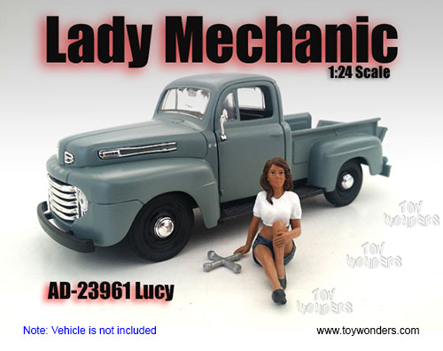23961 American Diorama Figurine - Lady Mechanic - Jessie. 1:24 scale female figure in a white shirt with blue shorts. Hand painted cold-cast resin. This 1.75"H figure is great for decorating 1:24 scale cars, auto body shop, and dioramas. Manufactured by American Diorama. Individually packed in a blister card. Card size: 4" x 7.5".