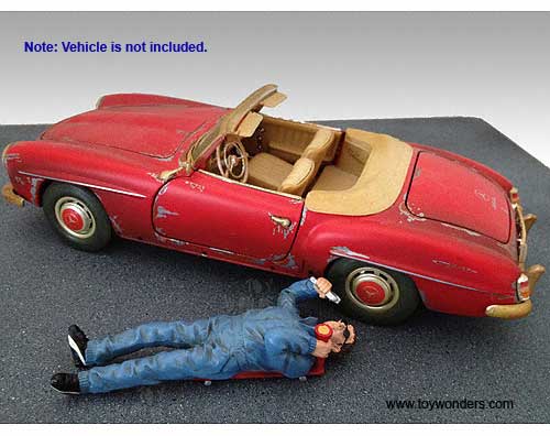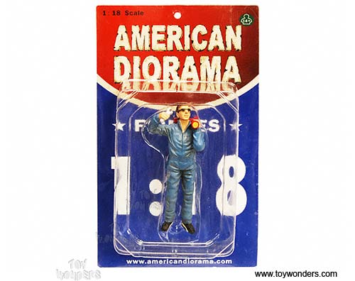 23791 American Diorama Figurine - 1:18 scale Mechanic Paul Figure in BLUE. Hand painted cold-cast resin. This 4" figure is great for decorating 1:18 scale cars, auto body shop, and dioramas. Manufactured by American Diorama. Individually packed in a blister card. Card size: 5" x 8.5". Note: Vehicle is not included.