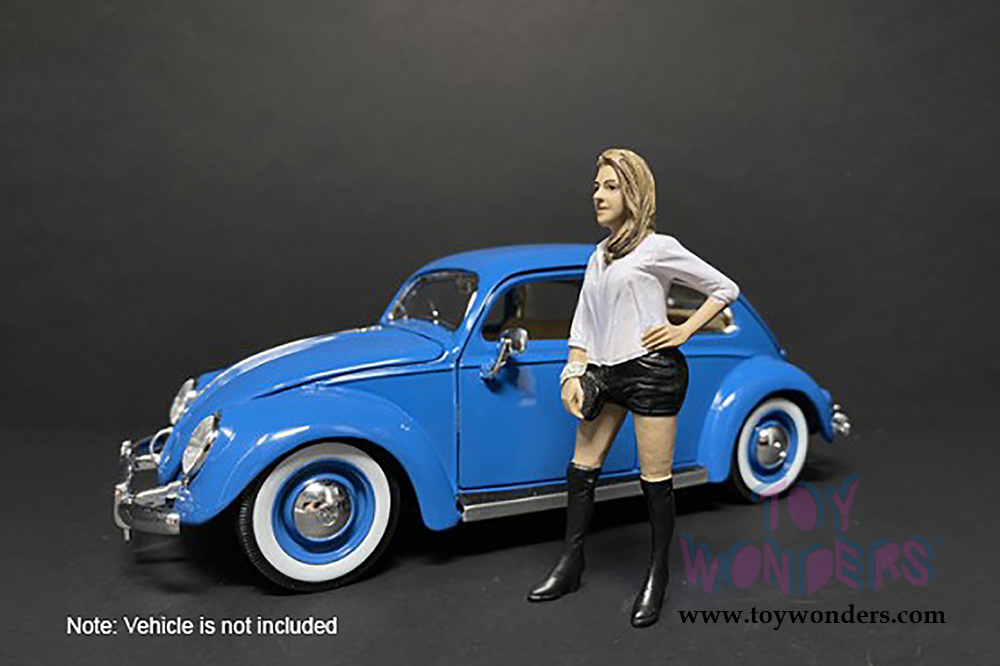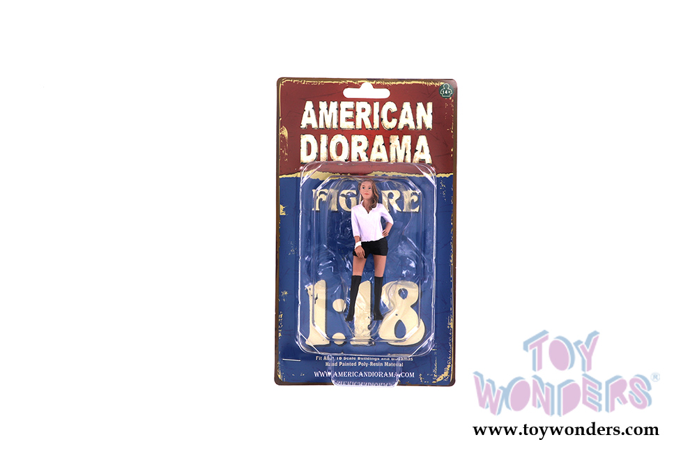 38227 American Diorama Figurine - 1:18 scale Partygoers Figure VII in black shorts and white blouse. Hand painted polyresin material. This 3.75" tall figure is great for decorating 1:18 scale cars and dioramas. Manufactured by American Diorama. Individually packed in a blister card. Card size: 5" x 8.5". 12 pcs per inner box. Note: Vehicle is not included.