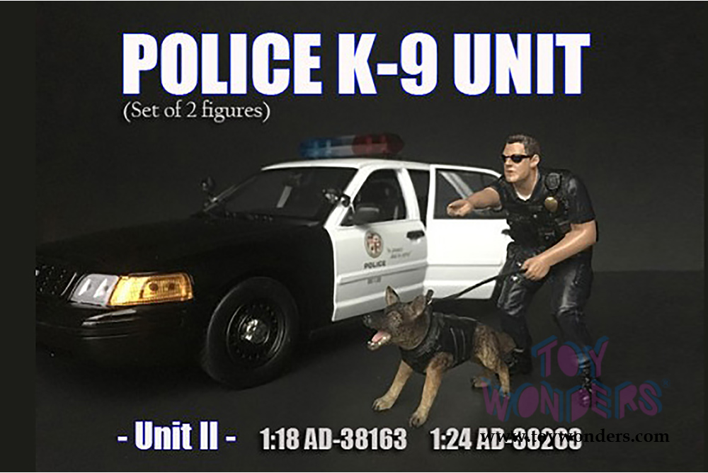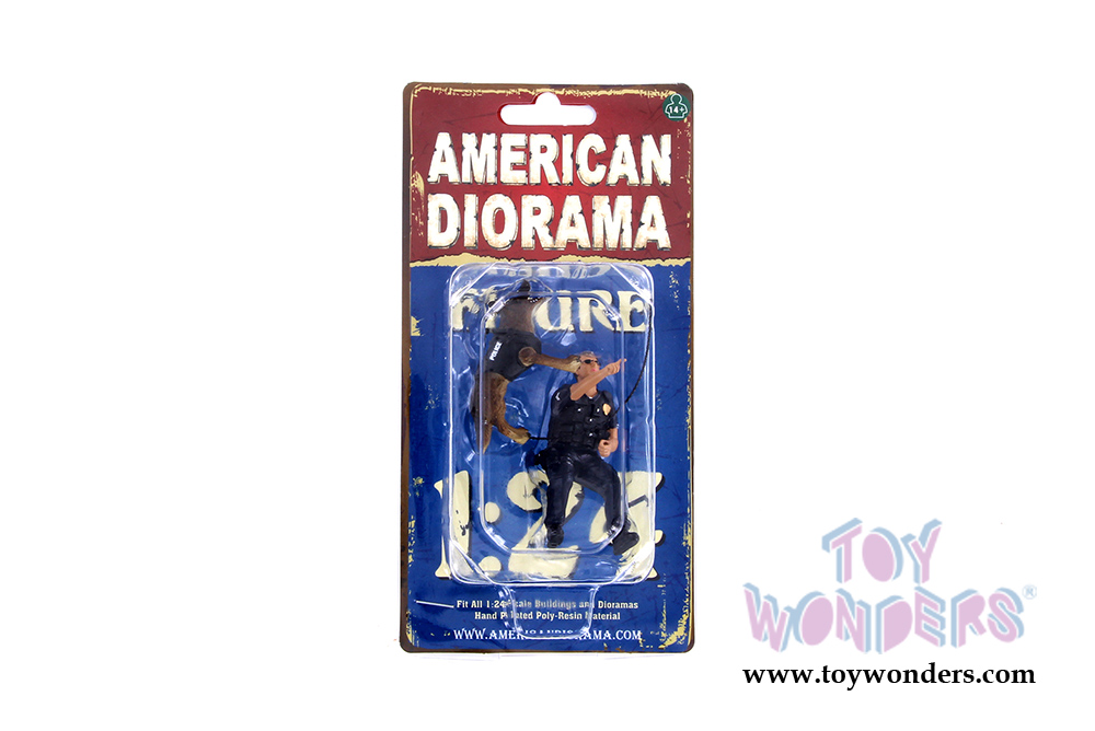 38264 American Diorama Figurine - Police Officer with K9 Dog Unit I (Set of 2). 1:24 scale male figure in black police uniform with dog.