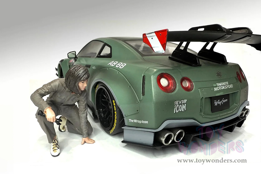 ADP-70105 American Diorama Figurine - Premium Series | Top Tuners Figure #5. 1:24 scale female figure in green mechanic coverall. High quality 3D printed figure, hand polish, hand painted features extra details on the figures seemless multi part articulations, perfect in any angles. This 2"H figure is great for decorating 1:24 scale cars, auto body shop and dioramas. Manufactured by American Diorama. Individually packed in a decorated box. Box size: 2.75"L x 1.375"W x 4.125"H. Note: Vehicle is not included.