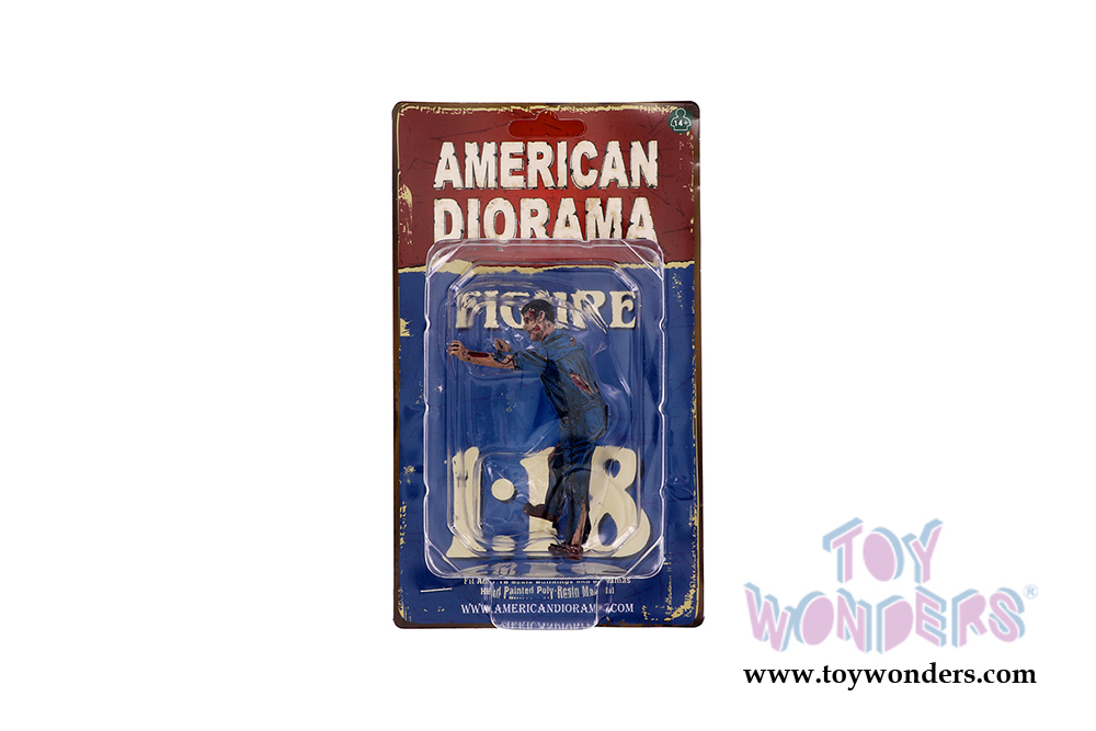 38200 American Diorama Figurine - Zombie Mechanic IV. 1:18 scale male Zombie in BLUE overalls. Hand painted polyresin material. This 4"H figure is great for decorating 1:18 scale cars and dioramas. Manufactured by American Diorama. Packed in a blister card. Card size: 5" x 8.5". 12 pcs. per inner. Note: Vehicle is not included.