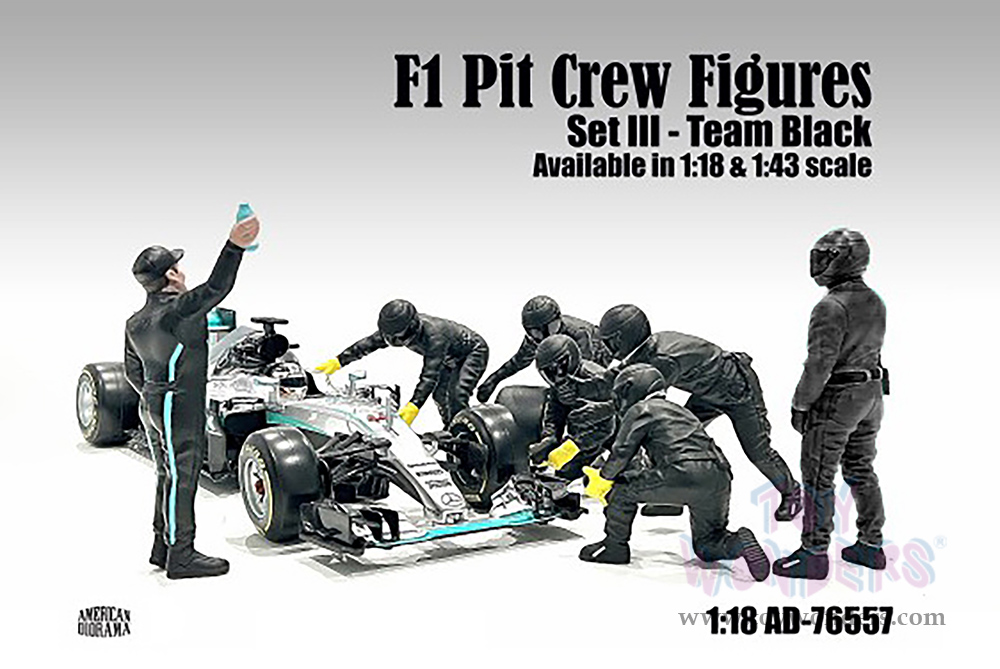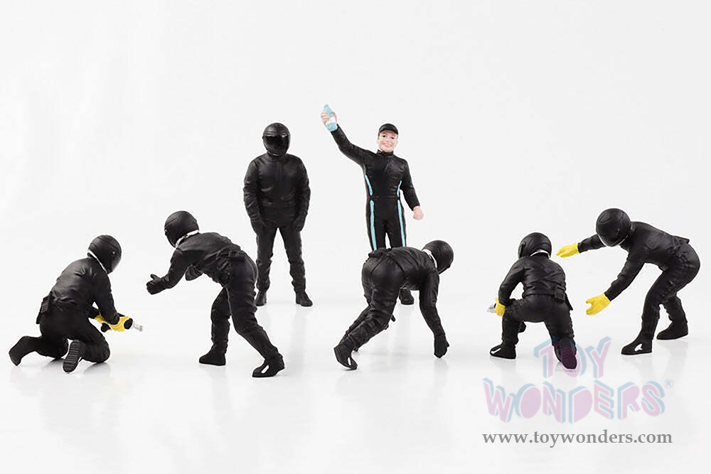 76557 American Diorama Figurines - Formula One F1 Pit Crew Team Black Set III - Set of 7 Figures. 1:18 scale male figures in black overalls. Hand painted cold-cast resin. These are 2.75" to 4" tall figures. Great for decorating 1:18 scale cars, auto body shop and dioramas. Manufactured by American Diorama. Individually packed in box. Box size: 11"Lx 8.5"Wx 3.25"H. Note: Vehicle is not included.